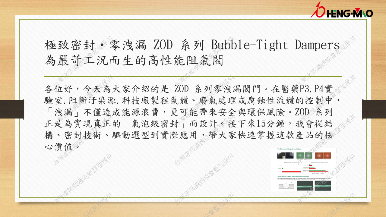 ZOD 系列絕對風門(Bubble-Tight Dampers)是一款專為高潔淨、高腐蝕與高風險工況打造的高性能阻氣設備,核心特色在於「極致密封、零洩漏」。透過重載法蘭結構、氟塑料刀鋒密封以及 ETFE 內塗層設計,ZOD 系列可在壓力與溫度波動下,仍維持優異的雙向氣泡級密封表現。